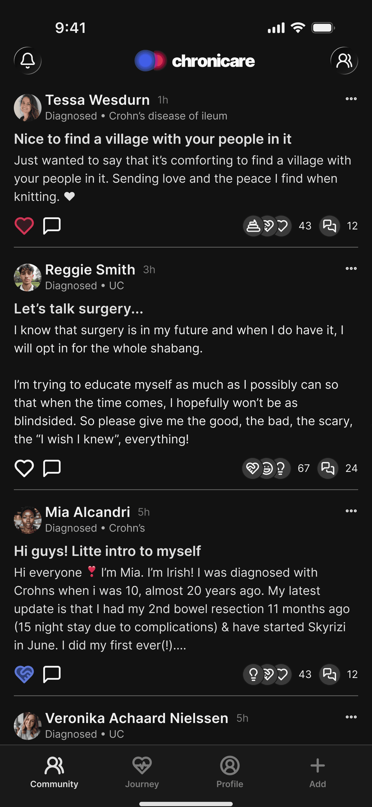 ⭐⭐⭐⭐⭐ “Being able to help create the tools I actually need as a colitis patient has been incredibly empowering. I’ve worked closely with the Chronicare team to make sure the symptom tracking and community features reflect real daily challenges. It feels amazing to see my feedback turn into features that genuinely help. ”