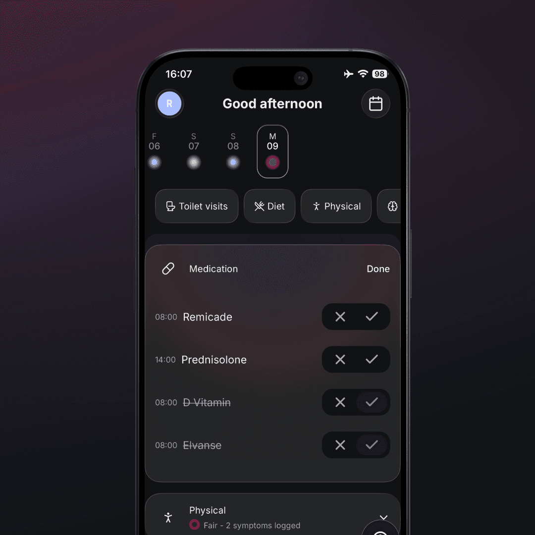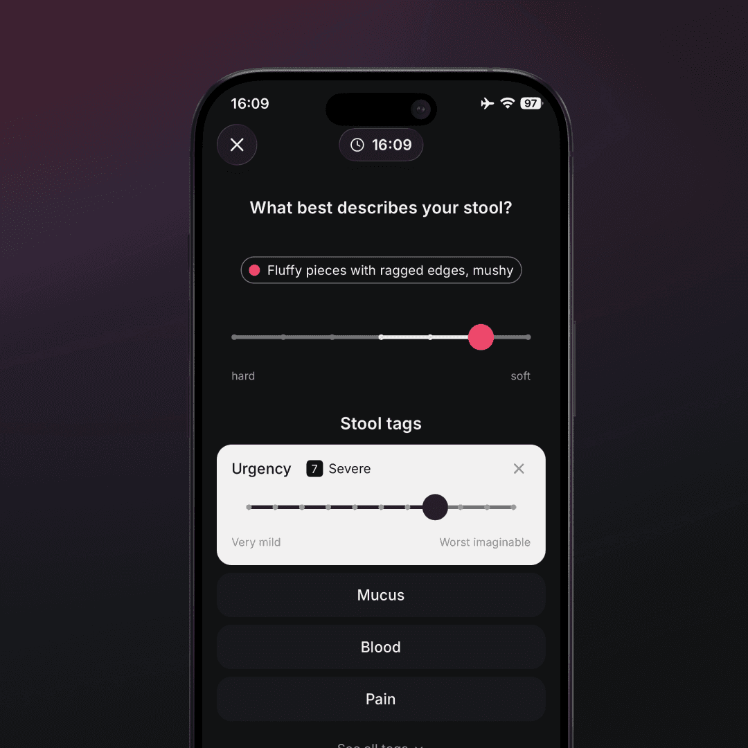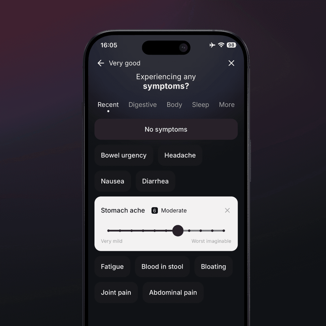 IBD isn't just about what happens in the bathroom; it’s a whole-body experience. Tracking your overall wellbeing means looking at both the visible and invisible parts of your health—like your energy levels, joint pain, infections, stress, mood, and more. By logging these together, you start to see the big picture and truly get to know your own body. Every journey with IBD is unique, which is why it’s so important to understand your own specific patterns. This helps you understand your own experience more clearly, and if you choose to share your logs with your care team, you'll have something concrete to refer to. Because IBD is closely tied to your nervous system, simply noticing when you feel 'off' or extra tired becomes easier to recognise over time when you log consistently.
